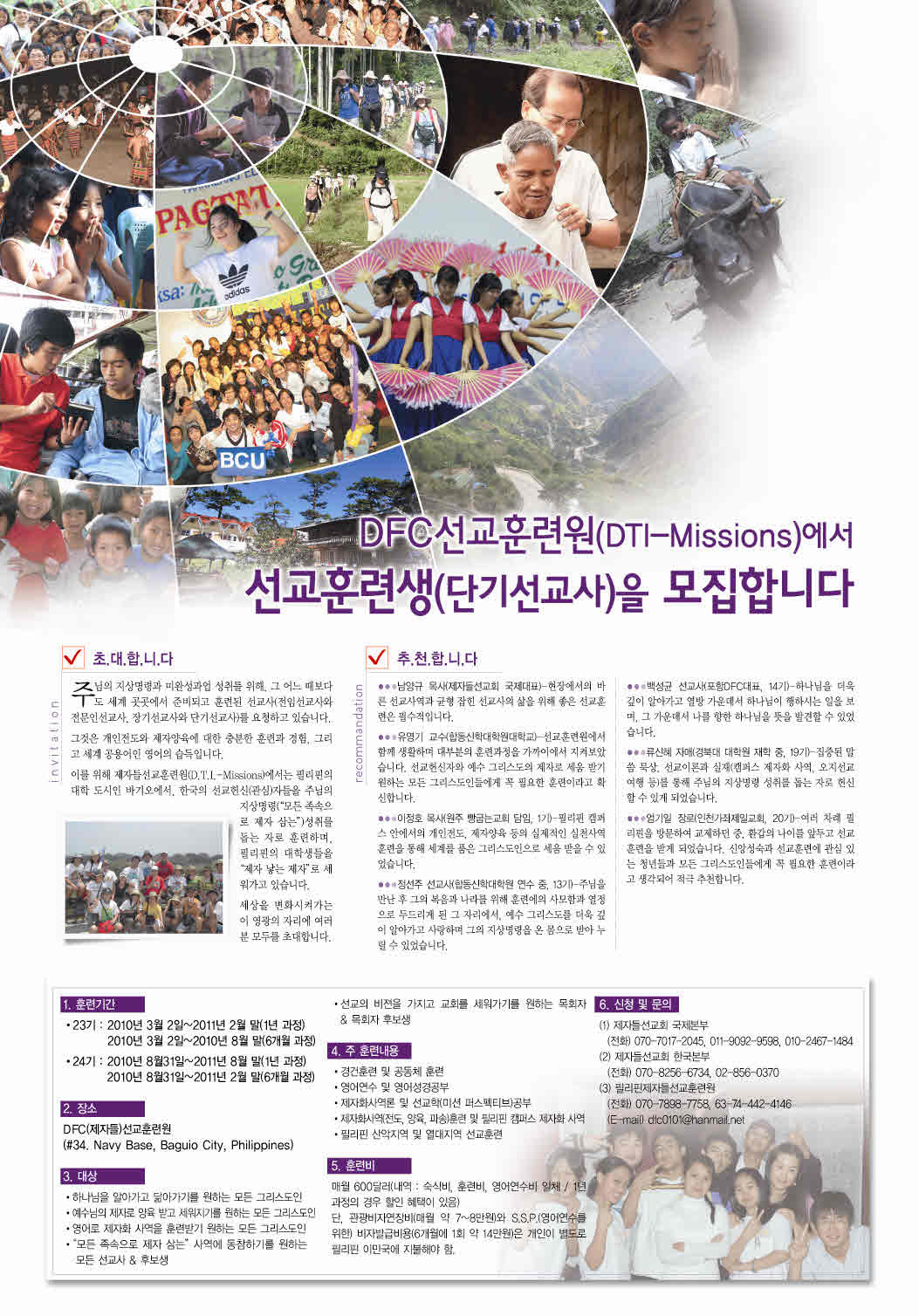 Çʸ®ÇÉ D.T.I.-Missions ¼±±³ÈƷûý 23±â ¸ðÁý °ø°í ÁÖ´ÔÀÇ Áö»ó¸í·É°ú ¹Ì¿Ï¼º°ú¾÷ ¼ºÃ븦 À§ÇØ, ±× ¾î´À ¶§º¸´Ùµµ ¼¼°è °÷°÷¿¡¼ ÁغñµÇ°í ÈÆ·ÃµÈ ¼±±³»ç (ÀüÀÓ¼±±³»ç¿Í Àü¹®Àμ±±³»ç, Àå±â¼±±³»ç¿Í ´Ü±â¼±±³»ç)¸¦ ¿äûÇϰí ÀÖ½À´Ï´Ù. ±×°ÍÀº °³ÀÎÀüµµ¿Í Á¦ÀÚ¾çÀ°¿¡ ´ëÇÑ ÃæºÐÇÑ ÈÆ·Ã°ú °æÇè, ±×¸®°í ¼¼°è °ø¿ë¾îÀÎ ¿µ¾îÀÇ ½ÀµæÀÔ´Ï´Ù. À̸¦ À§ÇØ Á¦ÀÚµé ¼±±³ ÈÆ·Ã¿ø(D.T.I.-Missions)¿¡¼´Â Çʸ®ÇÉÀÇ ´ëÇÐ µµ½ÃÀÎ ¹Ù±â¿À¿¡¼, Çѱ¹ÀÇ ¼±±³Çå½ÅÀÚµéÀ» ÁÖ´ÔÀÇ Áö»ó¸í·É(¡°¸ðµç Á·¼ÓÀ¸·Î Á¦ÀÚ »ï´Â¡±) ¼ºÃ븦 µ½´Â ÀÚ·Î ÈÆ·ÃÇϸç, Çʸ®ÇÉÀÇ ´ëÇлýµéÀ» ¡°Á¦ÀÚ ³º´Â Á¦ÀÚ¡±·Î ¼¼¿ö °¡°í ÀÖ½À´Ï´Ù. ¼¼»óÀ» º¯È½ÃÄѰ¡´Â ÀÌ ¿µ±¤ÀÇ ÀÚ¸®¿¡ ¿©·¯ºÐ ¸ðµÎ¸¦ ÃÊ´ëÇÕ´Ï´Ù. 1. ÈÆ·Ã±â°£ : 2010³â 3¿ù 2ÀÏ(¿¹Á¤) ~ 8¿ù¸»(6°³¿ù°úÁ¤) 2010³â 3¿ù 2ÀÏ(¿¹Á¤) ~ 2011³â 2¿ù ¸»(1³â°úÁ¤) 2. Àå¼Ò : Á¦Àڵ鼱±³ÈƷÿø(#34. Navy Base, Baguio City, Philippines ) 3. ´ë»ó - Çϳª´ÔÀ» ¾Ë¾Æ°¡°í ´à¾Æ°¡±â¸¦ ¿øÇÏ´Â ¸ðµç ±×¸®½ºµµÀÎ - ¿¹¼ö´ÔÀÇ Á¦ÀÚ·Î ¾çÀ° ¹Þ°í ¼¼¿öÁö±â¸¦ ¿øÇÏ´Â ¸ðµç ±×¸®½ºµµÀÎ - ¿µ¾î·Î Á¦ÀÚÈ »ç¿ªÀ» ÈÆ·Ã¹Þ±â ¿øÇÏ´Â ¸ðµç ±×¸®½ºµµÀÎ - "¸ðµç Á·¼ÓÀ¸·Î Á¦ÀÚ »ï´Â" »ç¿ª¿¡ µ¿ÂüÇϱ⸦ ¿øÇÏ´Â ¸ðµç ¼±±³»ç & È帻ý - ¼ºµµµéÀ» ¡®Á¦ÀÚ ³º´Â ¿¹¼ö´ÔÀÇ Á¦ÀÚ¡¯·Î ¼¼¿ö ÇÔ²² µ¿¿ªÇϱ⸦ ¿øÇÏ´Â ¼±±³»ç ¹× ¸ñȸÀÚ & È帻ý - ¼±±³ÀÇ ºñÁ¯À» °¡Áö°í ±³È¸¸¦ ¼¼¿ö°¡±â¸¦ ¿øÇÏ´Â ¸ñȸÀÚ & ¸ñȸÀÚ È帻ý 4. ¸ðÁýÀοø : 20¸í ³»¿Ü 5. ÁÖ ÈÆ·Ã³»¿ë - °æ°ÇÈÆ·Ã ¹× °øµ¿Ã¼ ÈÆ·Ã - ¿µ¾î¿¬¼ö ¹× ¿µ¾î¼º°æ°øºÎ - Á¦ÀÚȻ翪·Ð ¹× ¼±±³ÇÐ(¹Ì¼Ç ÆÛ½ºÆåƼºê)°øºÎ - Á¦ÀÚȻ翪(Àüµµ, ¾çÀ°, ÆÄ¼Û)ÈÆ·Ã ¹× Ä·ÆÛ½º Á¦ÀÚÈ »ç¿ª - Çʸ®ÇÉ »ê¾ÇÁö¿ª ¹× ¿´ëÁö¿ª ¼±±³ÈÆ·Ã 6. ÈÆ·Ãºñ : ¸Å¿ù 600´Þ·¯(³»¿ª: ¼÷½Äºñ, ÈÆ·Ãºñ, ¿µ¾î¿¬¼öºñ ÀÏü, 1³â°úÁ¤ÀÇ °æ¿ì ÇÒÀÎÇýÅÃÀÌ ÀÖÀ½), ÇàÁ¤ºñ 10¸¸¿ø, ¿Õº¹ Ç×°ø±Ç ºñ¿ë. ´Ü, °ü±¤ºñÀÚ ¿¬Àåºñ(¸Å ¿ù ¾à 6~7¸¸¿ø)¿Í S.S.P.(¿µ¾î¿¬¼ö¸¦ À§ÇÑ)ºñÀڹ߱޺ñ¿ë(6°³¿ù¿¡ 1ȸ 10¸¸¿ø)Àº °³ÀÎÀÌ º°µµ·Î Çʸ®ÇÉ À̹α¹¿¡ ÁöºÒÇØ¾ß ÇÔ. 7. Áö¿ø¹æ¹ý 1) ½Åû ¼·ù : ÈÆ·ÃÁö¿ø¼, Áöµµ±³¿ªÀÚ or Áöµµ¼±±³´Üü°£»ç Ãßõ¼, ¼¾à¼, ÀÚ±â¼Ò°³¼(A4 ÇÑÀå, ÈÆ·ÃÁö¿øµ¿±â ±â·Ï), ¿©±Ç»çº», ÇлýÁõ »çº»(ÇлýÀÎ °æ¿ì) * Áö¿ø¼, Ãßõ¼, ¼¾à¼ ¾ç½ÄÀº À̸ÞÀÏ·Î ¹ß¼ÛÇØ µå¸³´Ï´Ù. 2) ½Åû ¹æ¹ý : ½Åû ¼·ù¸¦ Á¦Àڵ鼱±³È¸¿¡ º¸³½ ÈÄ, ÈÆ·Ãºñ(3°³¿ù ÀÌ»ó)¿Í Ç×°ø·á(1³â ¿ÀÇ Ç×°ø±Ç, Ç×°ø»ç¿Í ±â°£¿¡ µû¶ó ±Ý¾× º¯µ¿ÀÌ ÀÖÀ½), ÇàÁ¤ºñ(10¸¸¿ø: Çʸ®ÇÉ ³» ±³Åëºñ, °øÇ×¼¼ µî)¸¦ ÁöÁ¤µÈ ÀºÇà°èÁ¿¡ ÀÔ±Ý 3) ½Åû ¸¶°¨ : 2010³â 2¿ù 10ÀÏ (1Â÷ ¸¶°¨) ¡Ø 1Â÷ ¸¶°¨ ¹Ì´Þ½Ã ¿¬ÀåÇÔ 4) ½Åû ¹× ¹®ÀÇ : (1) Á¦Àڵ鼱±³È¸ º»ºÎ: Tel: 070-7017-2045 (´ã´ç) À̼öÇö ¸ñ»ç dfc2004@hanmail.net 010-2467-1484 ±è±Ô¸¸ ¼±±³»ç shysmilewj@paran.com 010-7370-8017 ÁÖ¼Ò: ¼¿ïƯº°½Ã ±¸·Î±¸ ±¸·Î3µ¿ 197-10¹øÁö À̾ؾ¾ 2Â÷ 1301È£ (2) Á¦Àڵ鼱±³ÈƷÿø E-mail: dfc0101@hanmail.net ÀüÈ 070-7898-7758, 63-74-442-4146 8. Áö¿øÀÚ Áغñ¹° * Áֹεî·Ïµîº»2Åë(¿µ¹®); µ¿»ç¹«¼Ò¿¡¼ ¹ß±Þ. ¿µ¹®À̸§ÀÌ ¿©±Ç¿µ¹®À̸§°ú µ¿ÀÏÇØ¾ß ÇÔ. 1) ¿µ¿µ, ¿µÇÑ, ÇÑ¿µ»çÀü, °³ÀÎÀûÀ¸·Î ÇÊ¿äÇÑ Ã¥(½Å¾Ó, ¿µ¾î µî) 2) ¼º°æ(¿µÇÑ), Âù¼Û°¡, ³ëÆ®, Çʱⱸ, ±âŸ¹®±¸ 3) ¿©¸§¿Ê & º½, °¡À» ¿Ê(Á¶±Ý µÎÅÍ¿î °Ñ¿Ê ¸î ¹ú, ¾ÆÄ§ Àú³áÀ¸·Î´Â ¾à°£ Ãß¿ò) 4) ¼¼¸éµµ±¸, Ÿ¿ù, °£´ÜÇÑ ¾àǰ, Àü±âÀåÆÇ, ÀüÀÚ¸ð±âÇâ 5) ¼ö¿µº¹, ½½¸®ÆÛ, ½ãÅ©¸², ¸ðÀÚ, Ä«¸Þ¶ó(ÀÖÀ¸¸é), ¿îµ¿È, ±âŸ 6) ±¹Á¦Á÷ºÒÄ«µå(¿ëµ·À» ¼Û±Ý ¹ÞÀ» °æ¿ì¿¡: Cirrus ¸¶Å©°¡ ÀÖ´Â °ÍÀ¸·Î) <Æ÷½ºÅÍ> http://pudding.paran.com/shysmilewj/13283123 <È«º¸ µ¿¿µ»ó> http://pudding.paran.com/shysmilewj/13307000 <ȨÆäÀÌÁö> Çѱ¹DFC : http://www.dfc.or.kr/ ±¹Á¦DFC : http://dfcinternational.org/ |