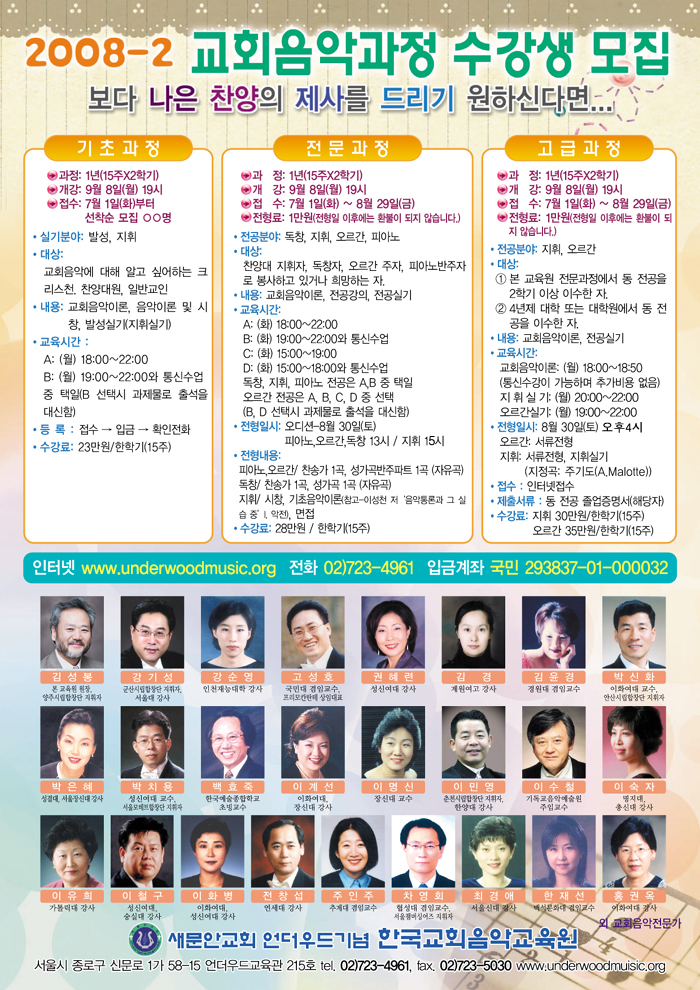 '±³È¸À½¾Ç°úÁ¤'Àº »õ¹®¾ÈÀ½¾Ç±³À°¿øÀÇ ´ëÇ¥ÀûÀÎ ±³À°°úÁ¤ÀÔ´Ï´Ù. 1 ³â ¼ö·á°úÁ¤À¸·Î ÀÌ·ç¾îÁ® ÀÖÀ¸¸ç 2ÇбâÁ¦ (ÇÑÇбâ15ÁÖ)ÀÔ´Ï´Ù. ÁÖ 1ȸ, 4½Ã°£¾¿ÀÇ ¼ö¾÷ÀÌ ÁøÇàµË´Ï´Ù. ÇöÀç ¸Å Çбâ 300¿©¸íÀÇ ¼ö°»ý µéÀÌ ±³È¸À½¾ÇÀ» °øºÎÇϰí ÀÖÀ¸¸ç ±¹³» ÃÖ°íÀÇ °»çÁøÀ¸·Î ü°èÀûÀÎ ±³À°À» ½Ç½ÃÇϰí ÀÖ½À´Ï´Ù. * ±âÃʰúÁ¤ (ÁöÈÖ¹Ý, ¹ß¼º¹Ý) ´ë»ó : ±³È¸À½¾Ç¿¡ ´ëÇØ ¾Ë°í ½Í¾îÇÏ´Â Å©¸®½ºÃµÀ¸·Î ±âÃʱ³À°ÀÌ ÇÊ¿äÇÑ ºÐ Á¢¼ö ÈÄ ÀÔ±Ý ¼±Âø¼øÀ¸·Î ¸ðÁý ±â °£ : 1³â (15ÁÖx2Çбâ) µî·Ïºñ : 23¸¸¿ø/ÇÑÇб⠱³À°½Ã°£ ¹× ³»¿ë : (15ÁÖX2Çбâ) 1³â ¼ö·á°úÁ¤ A: (¿ù) 18:00-22:00 B: (¿ù) 19:00-22:00°ú 1°ú¸ñ Åë½Å¼ö¾÷Áß ÅÃÀÏ (B ¼±Åýà °úÁ¦¹°·Î Ãâ¼®À» ´ë½ÅÇÔ) ¦Ç±âÃÊÁöÈÖ¹Ý: ±³È¸À½¾ÇÀÌ·Ð, À½¾ÇÀÌ·Ð ¹× ½Ãâ, ÁöÈֽDZâ, ÇÕâ ¦ÆÇÕâ¹ß¼º¹Ý: ±³È¸À½¾ÇÀÌ·Ð, À½¾ÇÀÌ·Ð ¹× ½Ãâ, ¹ß¼º½Ç±â, ÇÕâ * Àü¹®°úÁ¤ (ÁöÈÖ, µ¶Ã¢, ÇǾƳë, ¿À¸£°£) ´ë»ó : ¼º°¡´ë ÁöÈÖÀÚ, ¹ÝÁÖÀÚ, µ¶Ã¢ÀÚ·Î ºÀ»çÇϰí Àְųª Èñ¸ÁÇÏ ´Â ºÐ ¿Àµð¼Ç : 2008³â 8¿ù 30ÀÏ (Åä) µ¶Ã¢,ÇǾƳë,¿À¸£°£-13½Ã / ÁöÈÖ- 15½Ã ±â °£ : 1³â (15ÁÖx2Çбâ) Àü °ø: ÁöÈÖ, µ¶Ã¢, ¿À¸£°£¹ÝÁÖ, ÇǾƳë¹ÝÁÖ µî·Ïºñ : 28¸¸¿ø/ÇÑÇб⠱³À°½Ã°£ ¹× ³»¿ë : (15ÁÖX2Çбâ) 1³â ¼ö·á°úÁ¤ A: (È) 18:00-22:00 B: (È) 19:00-22:00°ú 1°ú¸ñ Åë½Å¼ö¾÷Áß ÅÃÀÏ (B ¼±Åýà °úÁ¦¹°·Î Ãâ¼®À» ´ë½ÅÇÔ) ¦ÇÁöÈÖÀü°ø: ±³È¸À½¾ÇÀÌ·Ð, ÁöÈֽDZâ, Àü°ø°ÀÇ ¦Éµ¶Ã¢Àü°ø: ±³È¸À½¾ÇÀÌ·Ð, ¼º¾Ç½Ç±â, Àü°ø°ÀÇ ¦Æ¹ÝÁÖÀü°ø: ±³È¸À½¾ÇÀÌ·Ð, ¿À¸£°£ (ÇǾƳë)¹ÝÁֽDZâ, Àü°ø°ÀÇ ½Ç±â¼ö¾÷¹æ½Ä : °ø°³·¹½¼ * °í±Þ°úÁ¤ (ÁöÈÖ, ¿À¸£°£) ´ë»ó : ¨çº» ±³À°¿øÀÇ Àü¹®°úÁ¤¿¡¼ µ¿ Àü°øÀ» 2Çбâ ÀÌ»ó À̼öÇÑ ÀÚ. ¨è 4³âÁ¦ ´ëÇÐ ¶Ç´Â ´ëÇпø¿¡¼ µ¿ Àü°øÀ» À̼öÇÑ ÀÚ. ¿À¸£°£ : ¼·ùÀüÇü ÁöÈÖ : ¼·ùÀüÇü ¹× ¿Àµð¼Ç 2008³â 8¿ù 30ÀÏ(Åä) 16½Ã ±â °£ : 1³â (15ÁÖx2Çбâ) Àü °ø: ÁöÈÖ, µ¶Ã¢, ¿À¸£°£¹ÝÁÖ, ÇǾƳë¹ÝÁÖ µî·Ïºñ : (ÁöÈÖ) 300,000¿ø / (¿À¸£°£) 350,000¿ø ±³À°½Ã°£ ¹× ³»¿ë : (15ÁÖX2Çбâ) 1³â ¼ö·á°úÁ¤ (ÁöÈÖ) ¿ù 8:00~10:00 / (¿À¸£°£) 7:00~10:00 ½Ç±â¼ö¾÷¹æ½Ä : °ø°³·¹½¼ www.underwoodmusic.org |